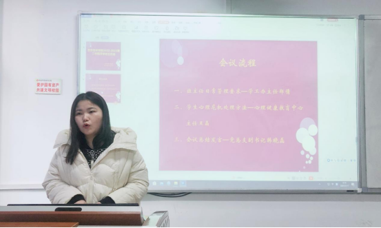 王晶着重从班主任如何精准有效发现疑似精神障碍类学生,如何展开心理评估、确定学生心理疾病严重程度,如何有效掌握交流话术与学生开展谈心谈话以及如何精准有效的采取措施、有的放矢的处理学生心理危机事件等四方面展开讲解培训,层层递进,为学院班主任、辅导员全方位搭建了集咨询服务、预防干预、平台保障、实践活动、教育教学“五位一体”的心理健康预警机制及工作格局。